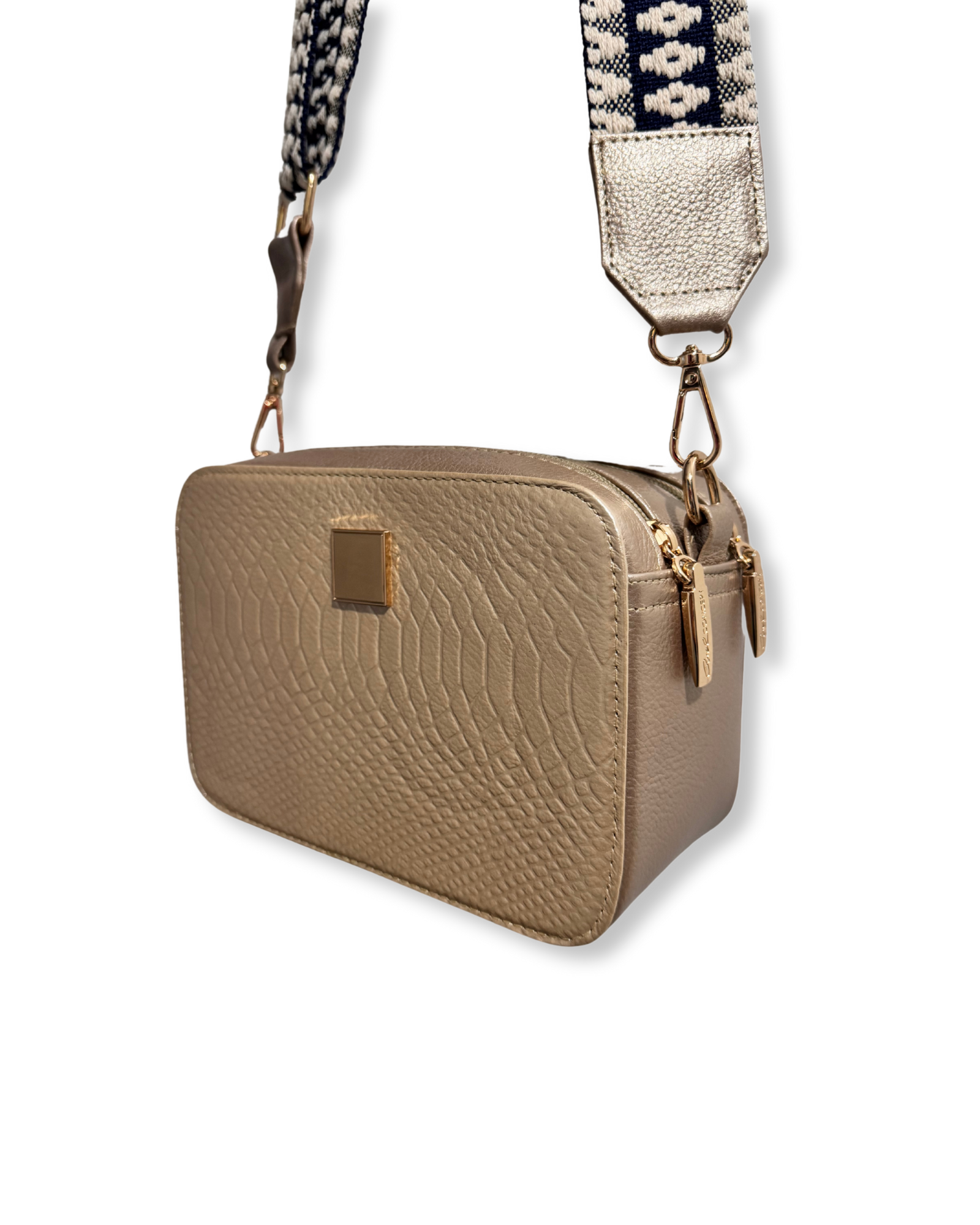 Cartera manos libres en cuero con cargadera tejida Lola dorado